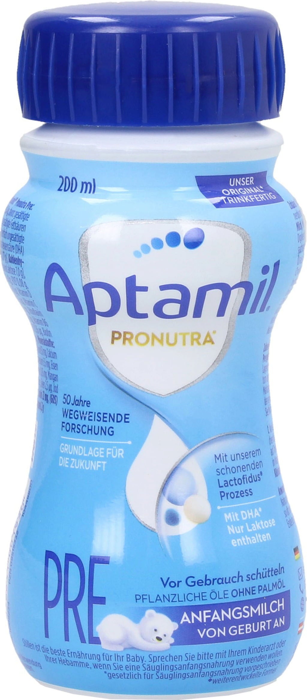The ready-to-drink Aptamil Pronutra PRE Infant Formula is particularly practical when you are out and about. No need to measure out, mix and shake. Simply pour the required amount into your baby's clean bottle and either offer it directly at room temperature or warm it up. As with every other infant formula by Aptamil, the recipe of the ready-to-drink version is precisely tailored to the nutritional needs of infants and babies. Free from palm oil.