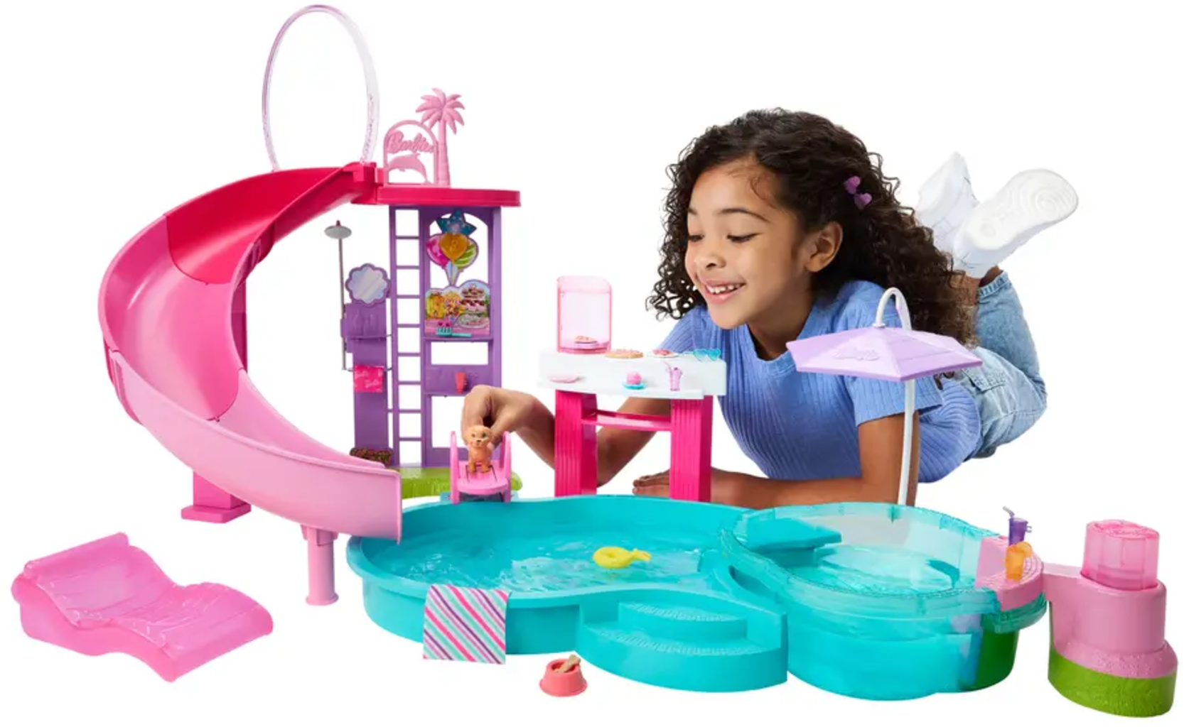 With the Barbie Dream Pool Playset, every day becomes a little summer dream. Children can send their Barbie dolls (sold separately) hurtling down the slide, relax in the foaming whirlpool or enjoy tasty snacks at the snack bar. More than 20 accessories are included, such as swimming rings, towels, a beach ball, and a cute little dog, making every pool party even more colourful and fun.