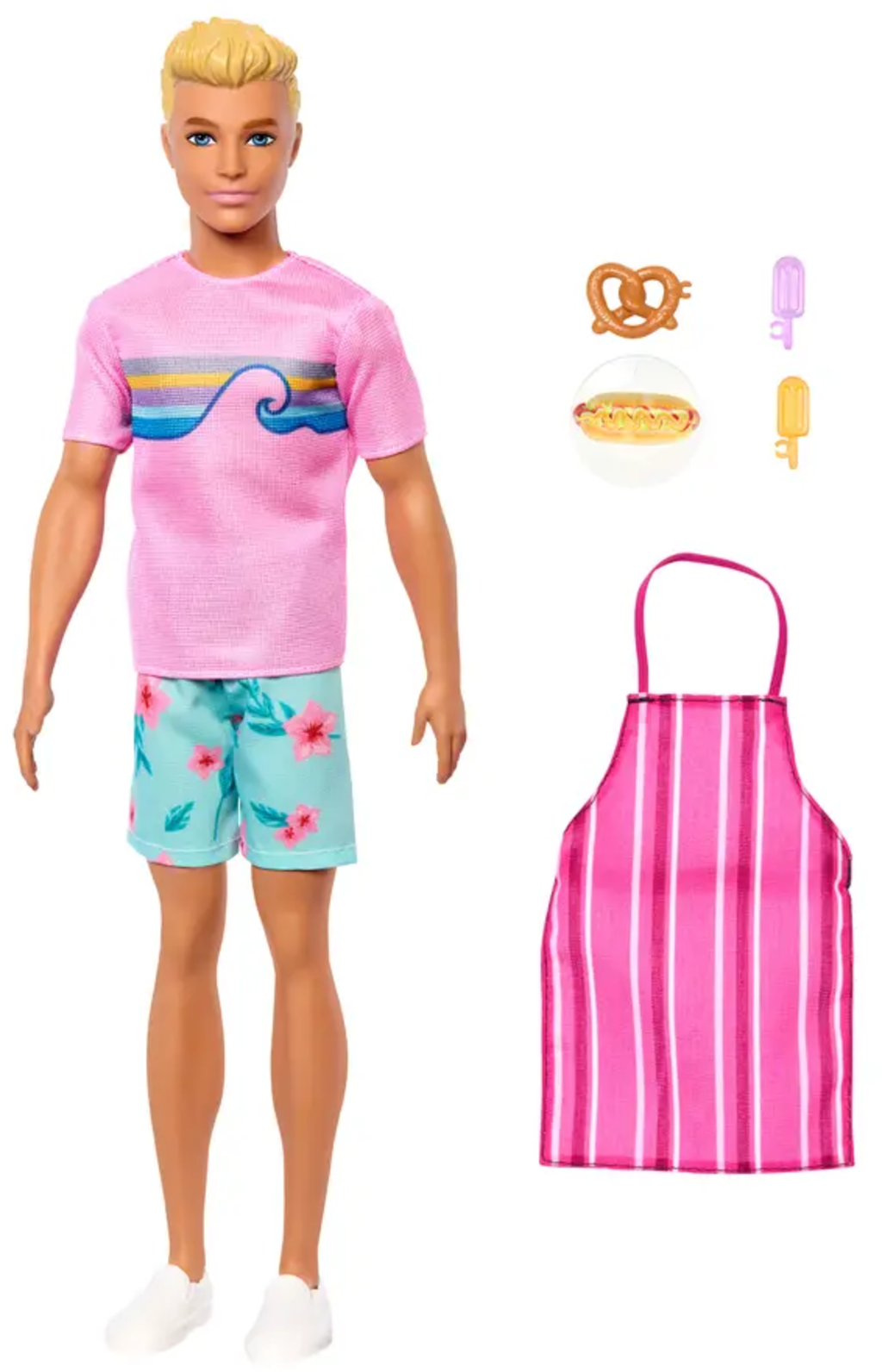 With the Ken doll from the "Barbie Mysteries: Beach Detectives" series, children can immerse themselves in exciting beach adventures. With his stylish pink T-shirt, summery shorts with a floral pattern and white trainers, Ken is ready to solve any mystery by the sea. Thanks to lovingly designed accessories such as an apron, pretzel, hot dog and ice cream, he can experience completely new stories - whether as a snack vendor or beach hero.