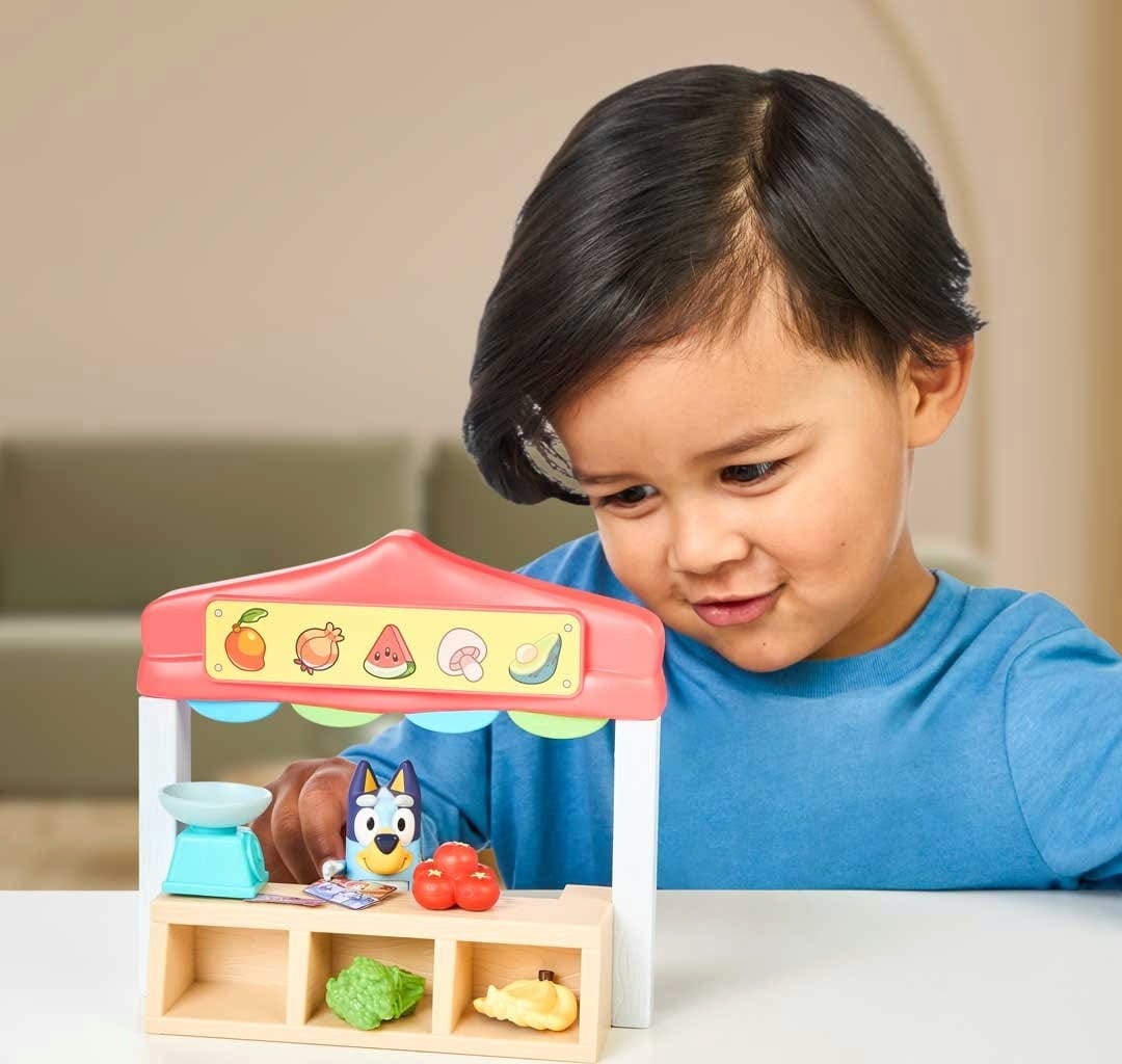 The set is perfectly tailored to the motor skills of pre-school children and encourages imagination through role play. Thanks to its compatibility with other Bluey figures, the visit to the market can be extended as required. A colourful sticker sheet also ensures individual design fun during assembly.