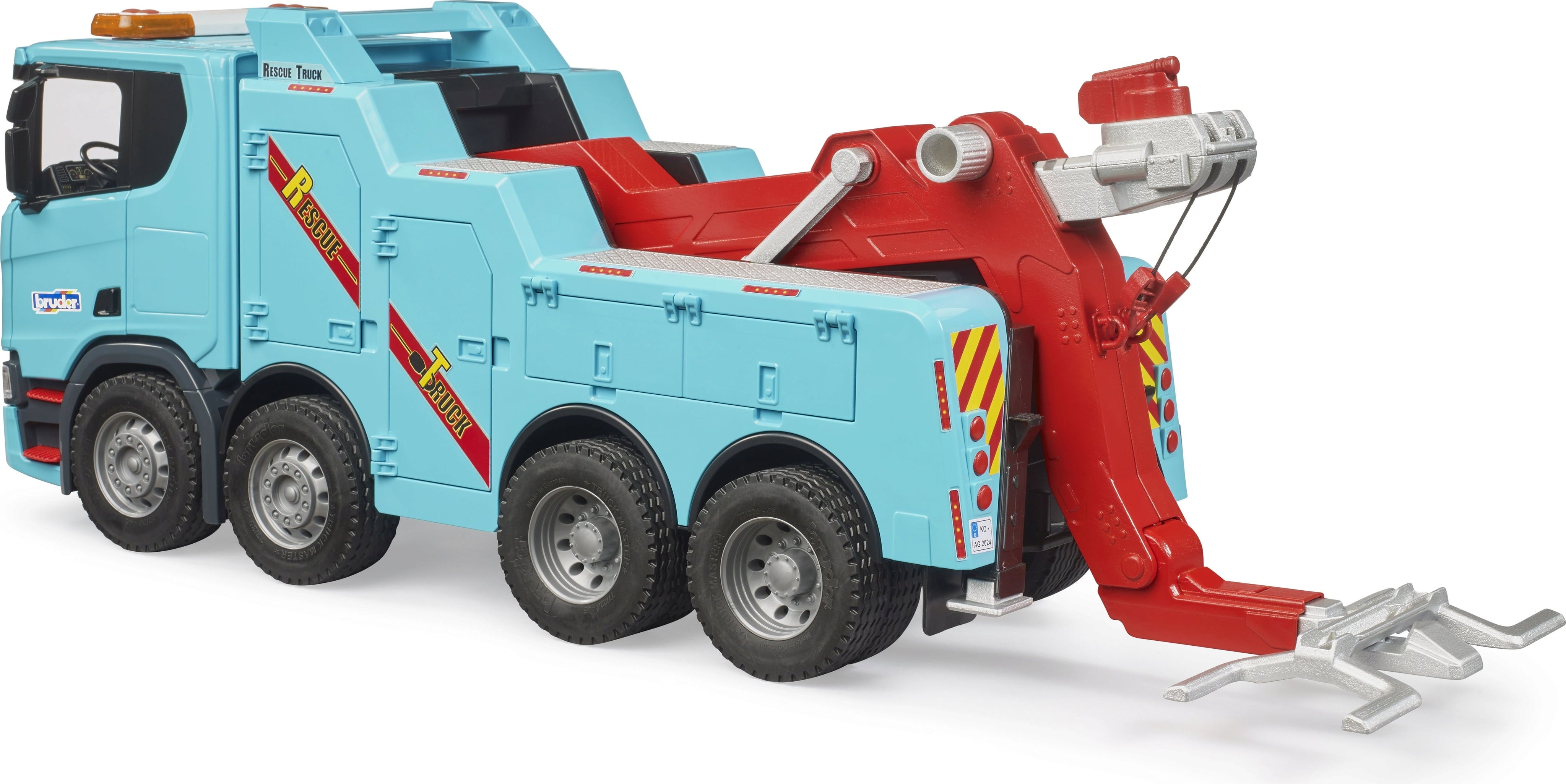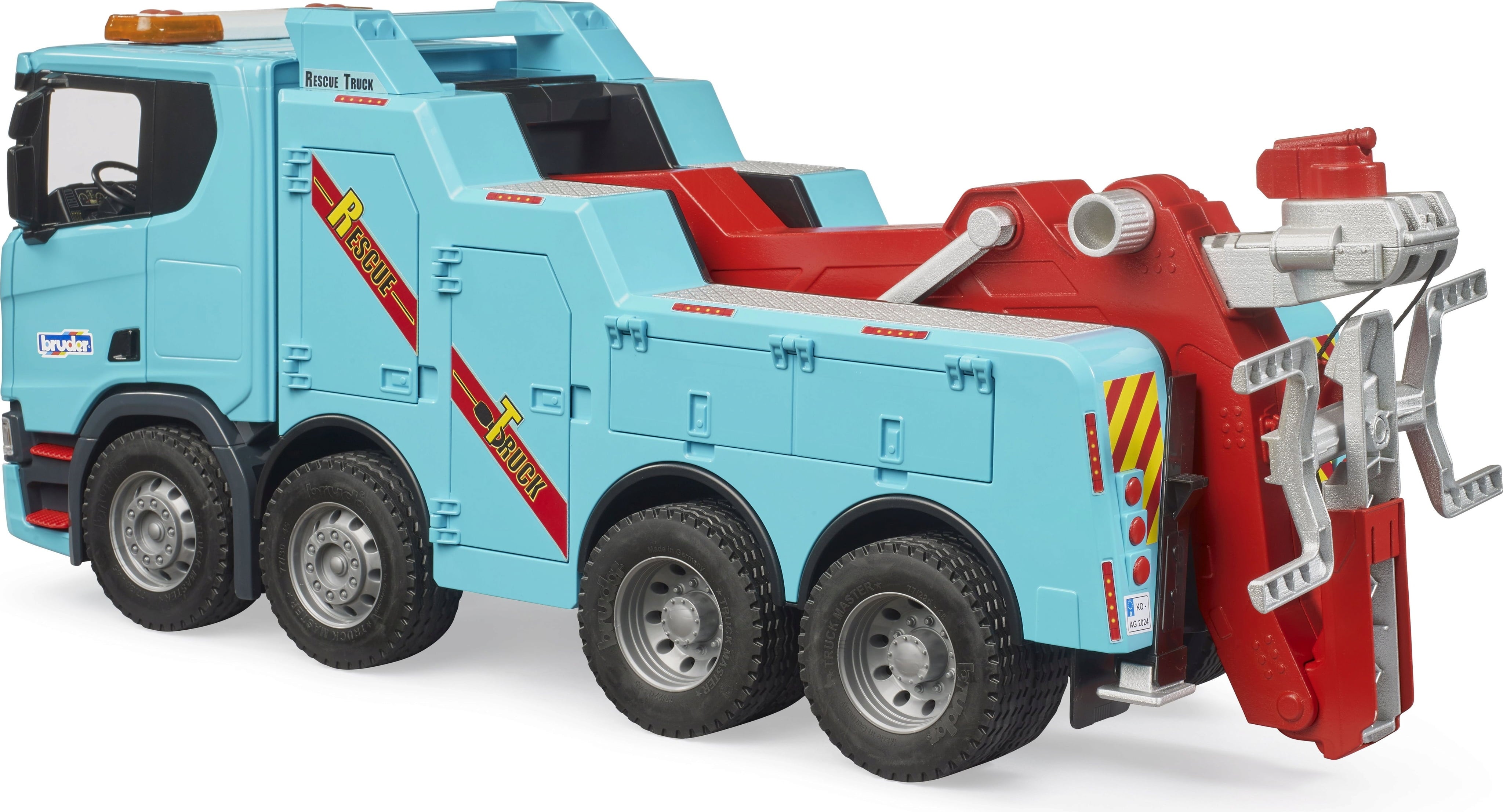 The detailed Scania Super 560R tow truck is the unbeatable hero on every toy motorway. Equipped with a powerful crane arm and fold-down towing goggles, it is ready to help any vehicle out of a jam. The fantastic Light & Sound module makes the operation particularly realistic and exciting.