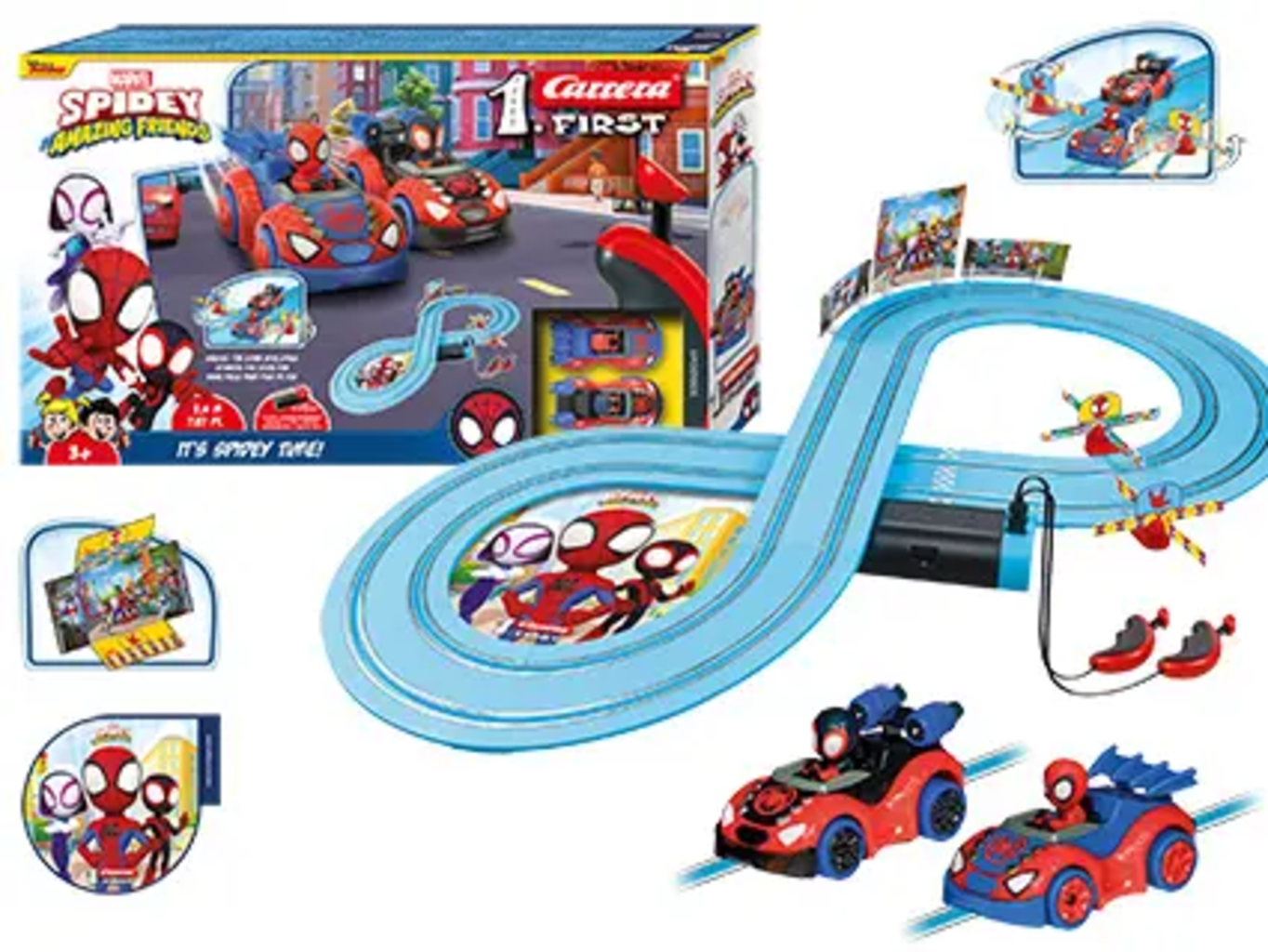 How about a friendly competition between superheroes? Spidey and Spin don't need to be told twice. They immediately jump into their racing cars and start the engines. They race across an approximately 2.4 metre long track, which is equipped with matching decorative elements, in no time at all.