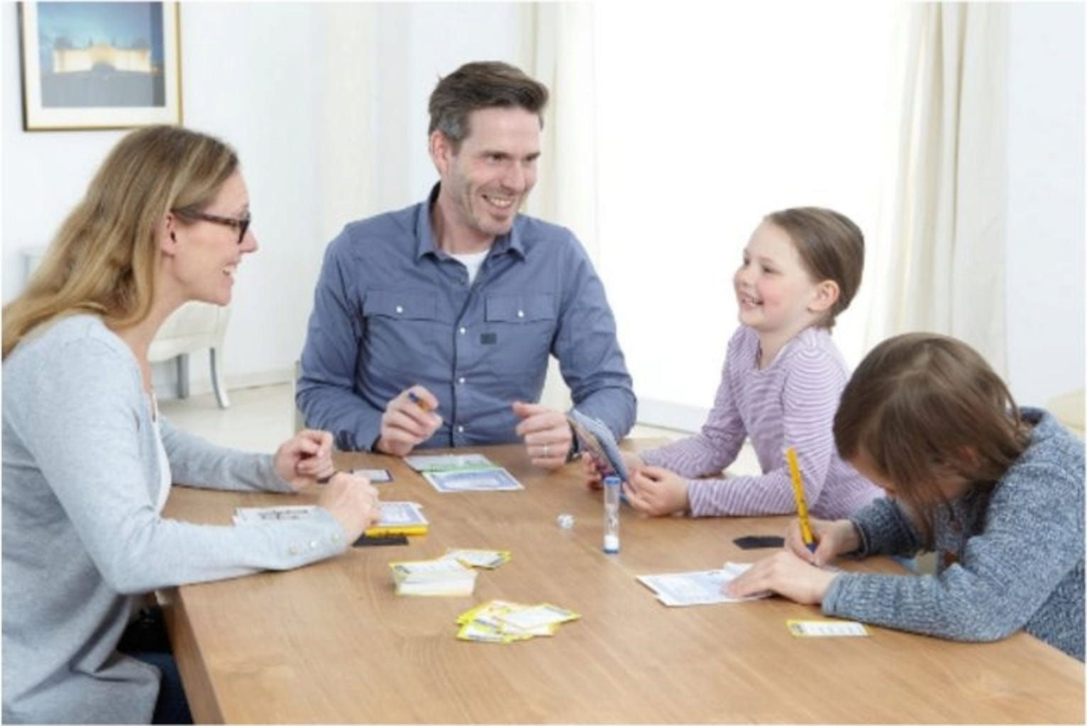 Contents: 100 cards with 1200 themes, 6 erasable pads with coloured binding, 6 pens with erasable ink, 6 erasing cloths, 1 timer with 60 seconds, 1 dice, instructions in German.