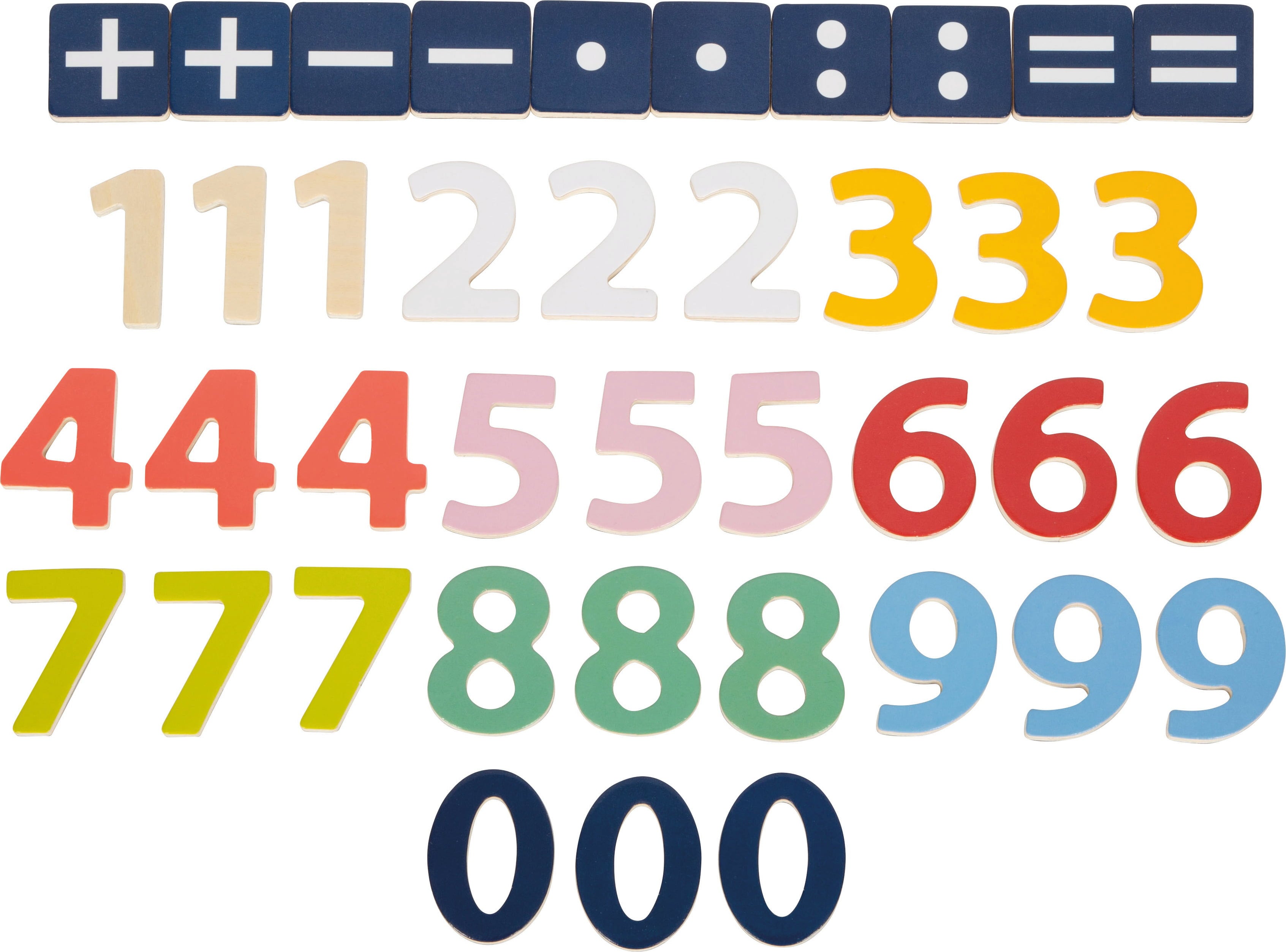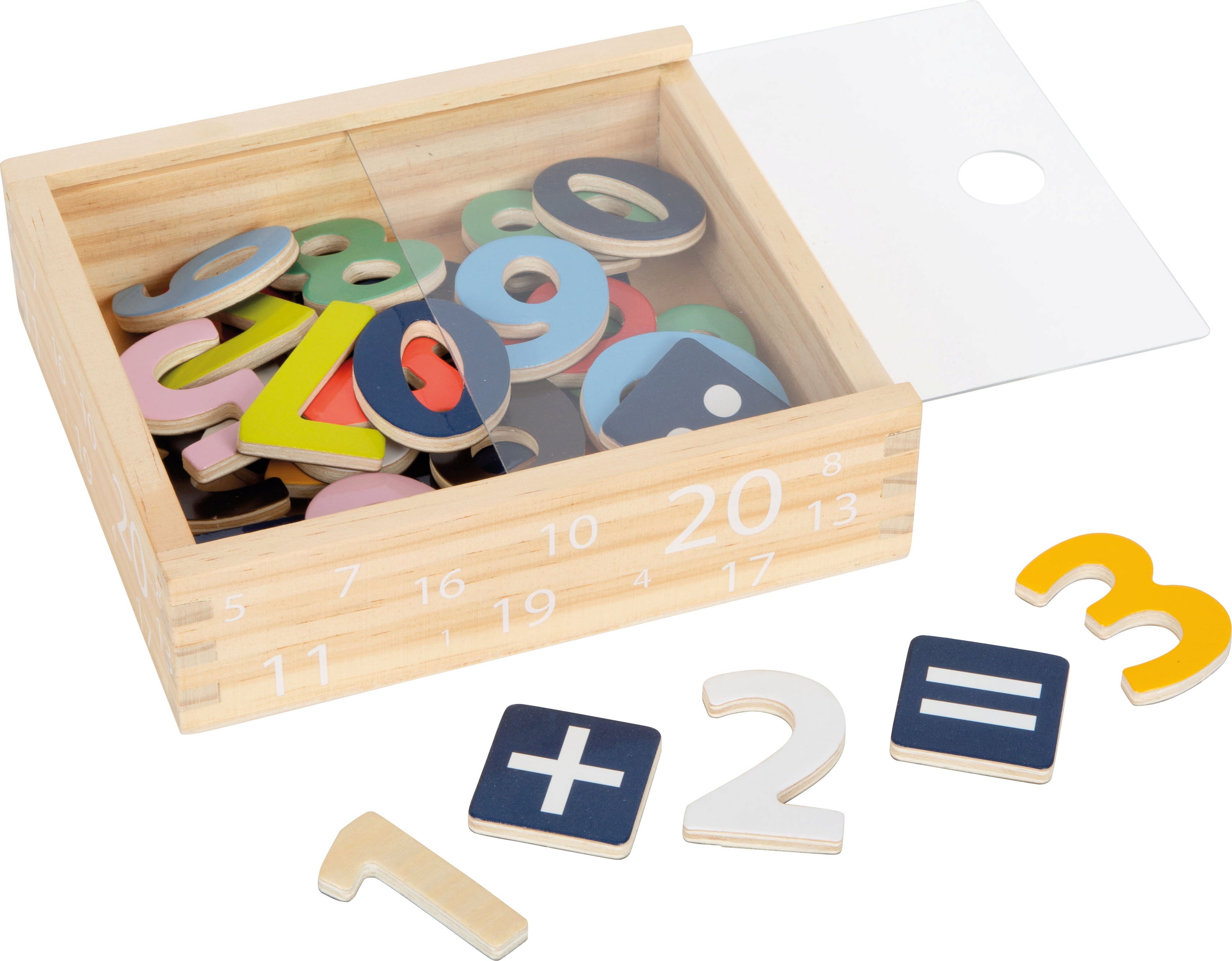 With the right toy, arithmetic is really fun! This great wooden box contains 40 digits and arithmetic symbols that invite children to practice, tinker and puzzle. All the numbers can be attached to magnetic surfaces, and also look great on school boards.