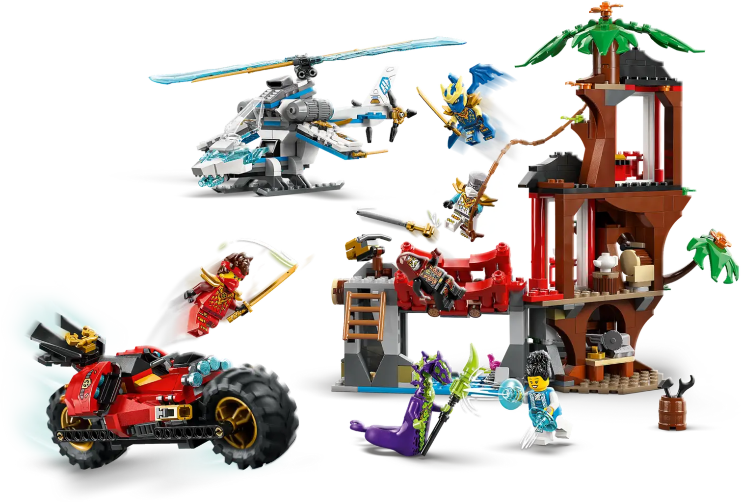 - Includes tree house, ninja bike & helicopter with movable & authentic details