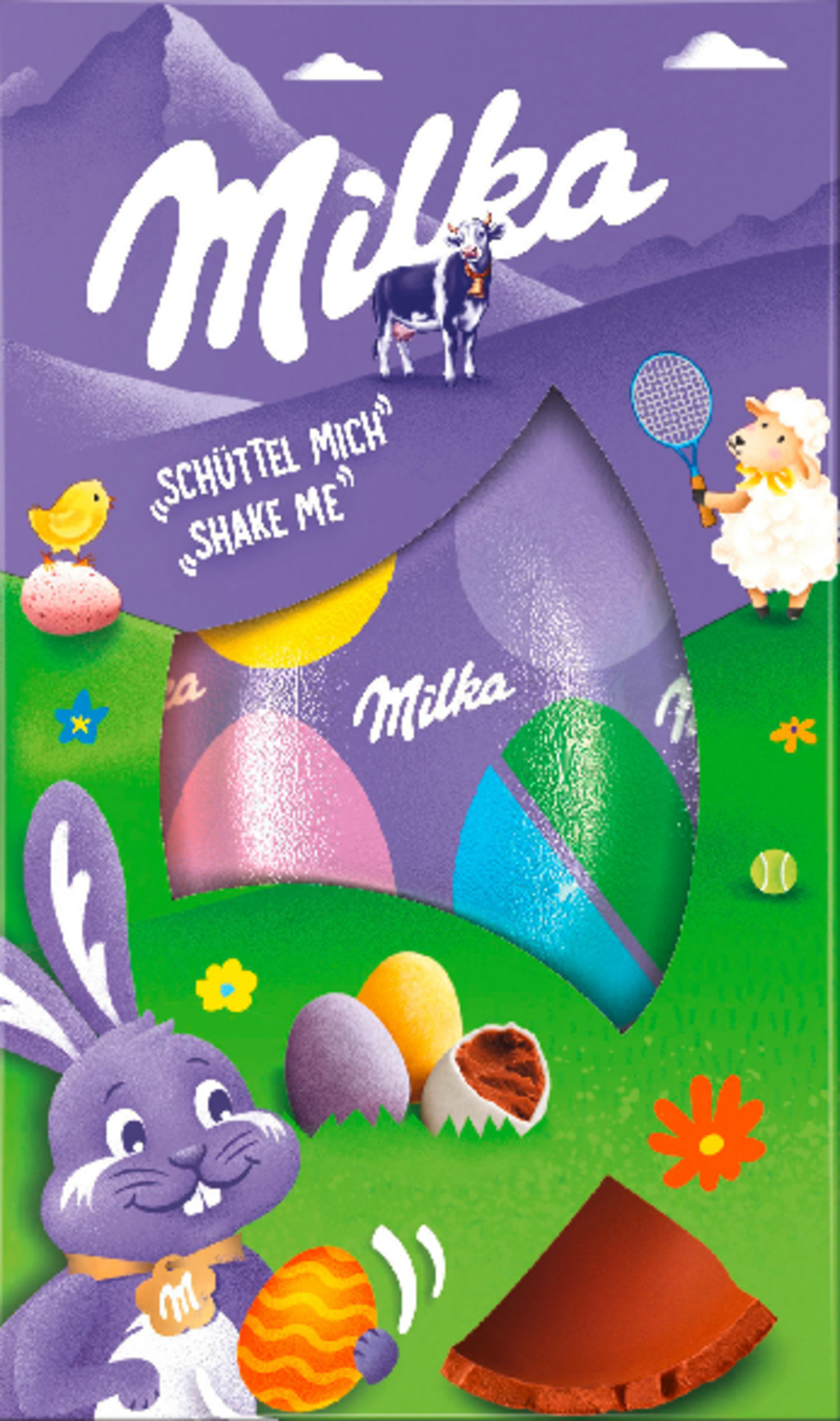 This Milka "Shake Me" egg brings a playful touch to the Easter season. The outer shell is made of smooth Alpine milk chocolate and contains sugar-coated mini eggs with a fine cocoa cream filling that make a rattling sound when shaken. The colourful packaging creates a sense of anticipation as you wait to discover what's hidden inside the smooth chocolate shell.