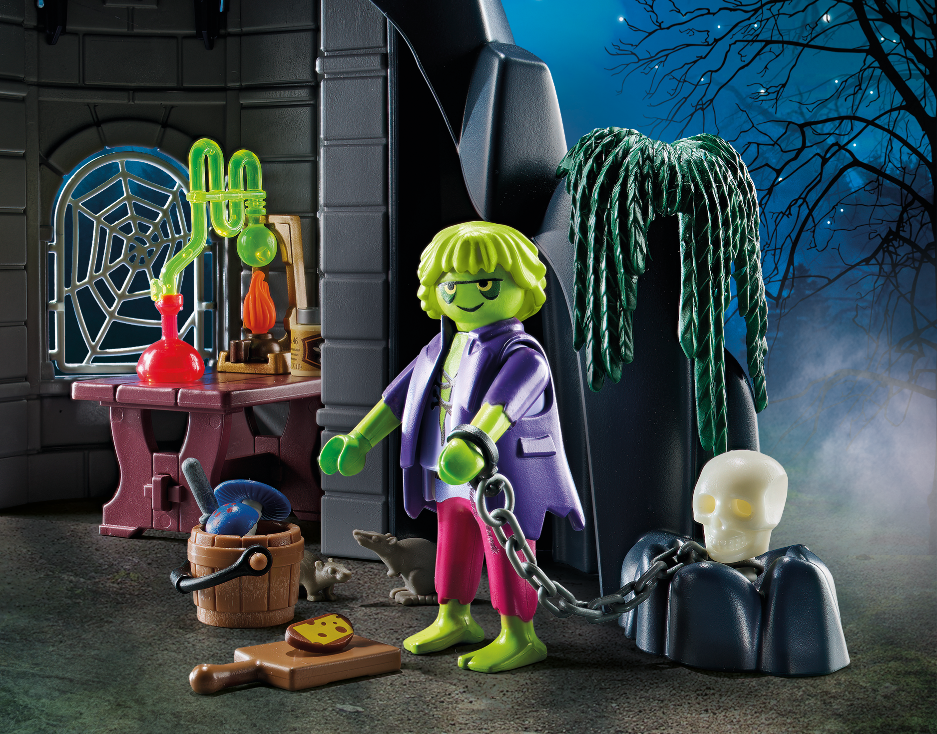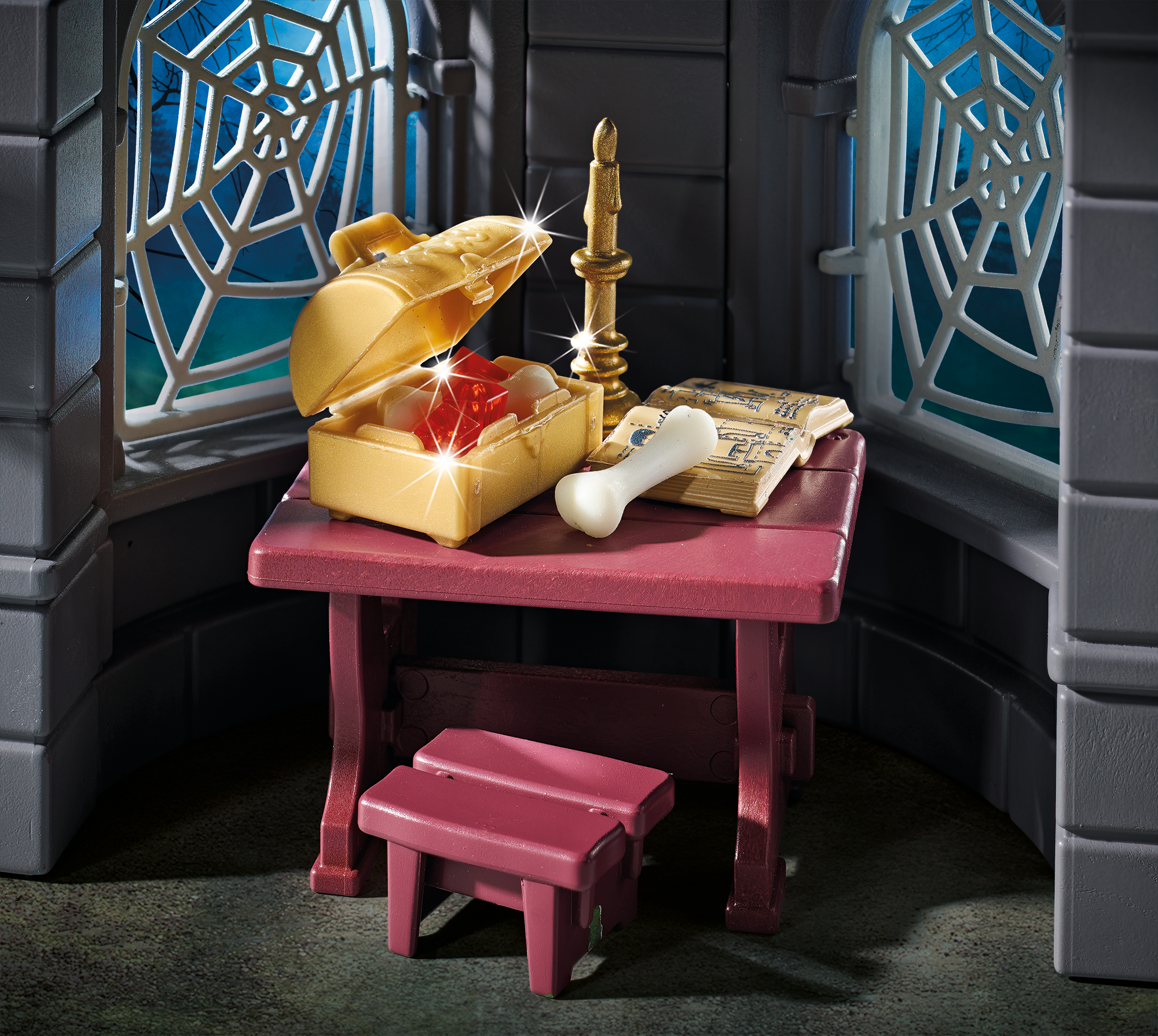 - Accessories: 1 tricorn hat, 1 apron, 1 cape, 1 scroll, 1 staff with bat attachment, 8 wall pieces, 2 windows with spider web, 1 ladder, 1 tree, 3 hanging plants, 1 spider web, 1 skull, 1 candle, 1 torch, 1 throne, 1 treasure chest, 2 bones, 1 chain with shackle, 1 chopping board, 1 piece of cheese, 1 table, 1 stool, 2 laboratory glasses, 1 distillation glass with holder, 1 oil lamp, 1 quill with holder, 1 book, 1 knife, 3 crystals, 1 "crypt" figure, 1 shield, 2 horns