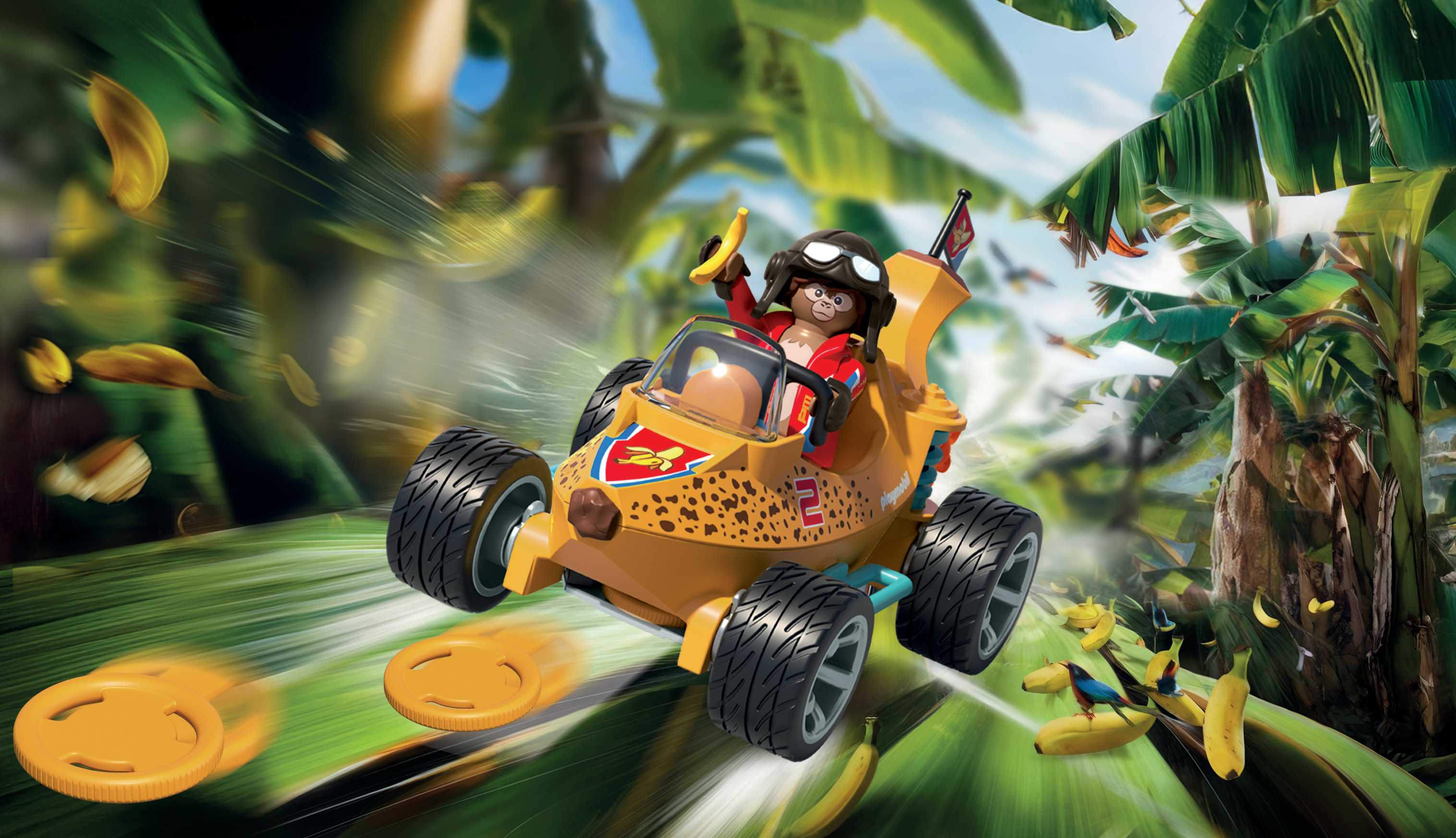 The banana vehicle makes every racetrack tremble. With a disc shooter, fire drive and stylish monkey racer in the cockpit, children can drive exciting races and experience imaginative adventures. A helmet, gloves, and flag round off the humorous set - action, fun and creativity are guaranteed!