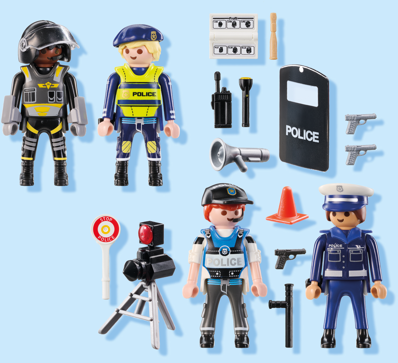Accessories: 3 holsters with pistols, 1 police shield, 1 police multi-purpose baton, 1 SEK protective waistcoat, 1 police trowel, 1 mobile radio telephone, 1 mobile radar flasher, 1 police waistcoat, 1 paint box with brush, 1 torch, 1 megaphone, 2 traffic cones