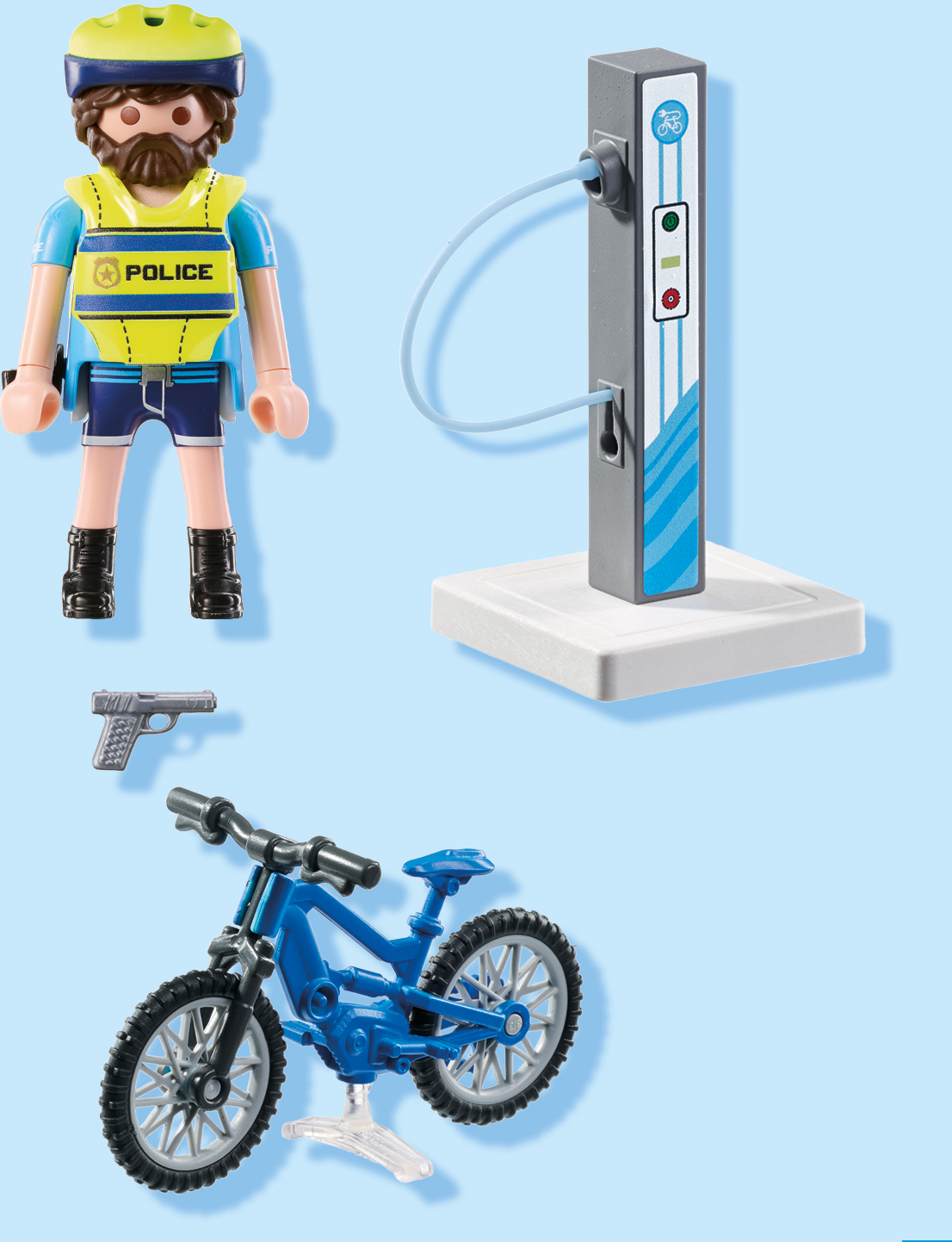 Accessories: 1 e-charging station, 1 e-bike, 1 holster with pistol, 1 police warning waistcoat