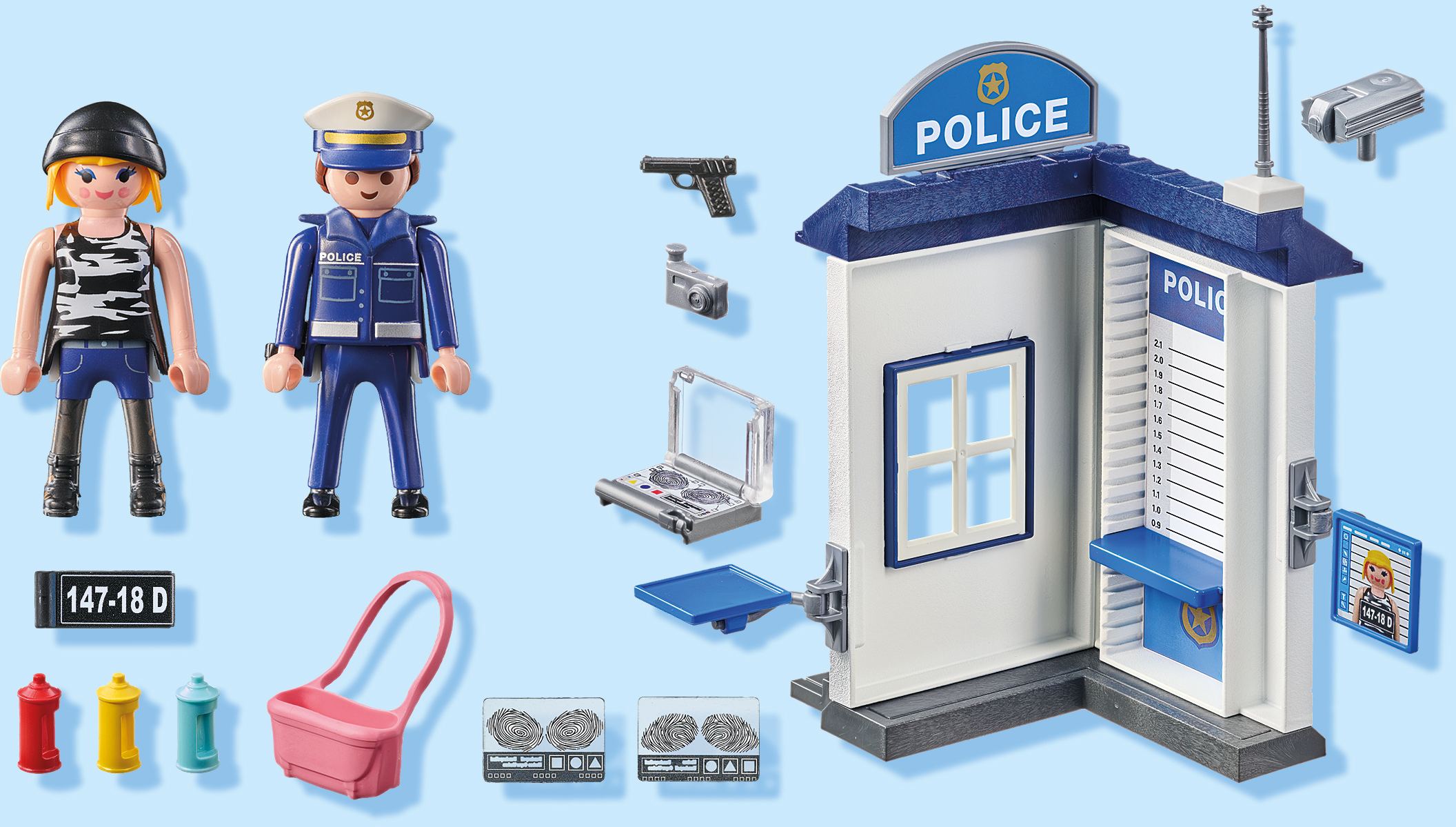 Accessories: 2 wall sections with roof elements and windows with grilles and roof lights, 1 sticker for confronting the perpetrator, 1 picture of the perpetrator on a swivelling board, 1 notebook with fingerprint slides to slide in, 1 swivelling laptop table, 1 shoulder bag, 3 spray cans, 1 camera, 1 holster with pistol