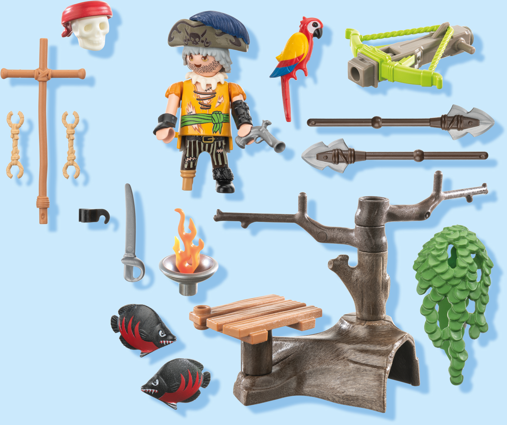 Accessories: 1 tree stump, 2 branches, 1 tree extension, 1 fire bowl with fire, 1 hanging plant, 1 pedestal, 1 wooden cross, 1 skull, 1 headband, 2 projectiles, 1 holder for projectile, 1 ballista, 1 hat, 1 feather for hat, 1 pistol, 1 dagger, 1 clip, 2 arm cuffs