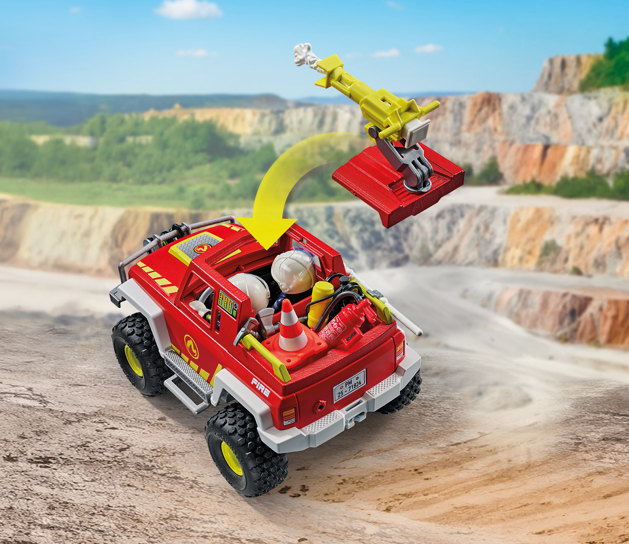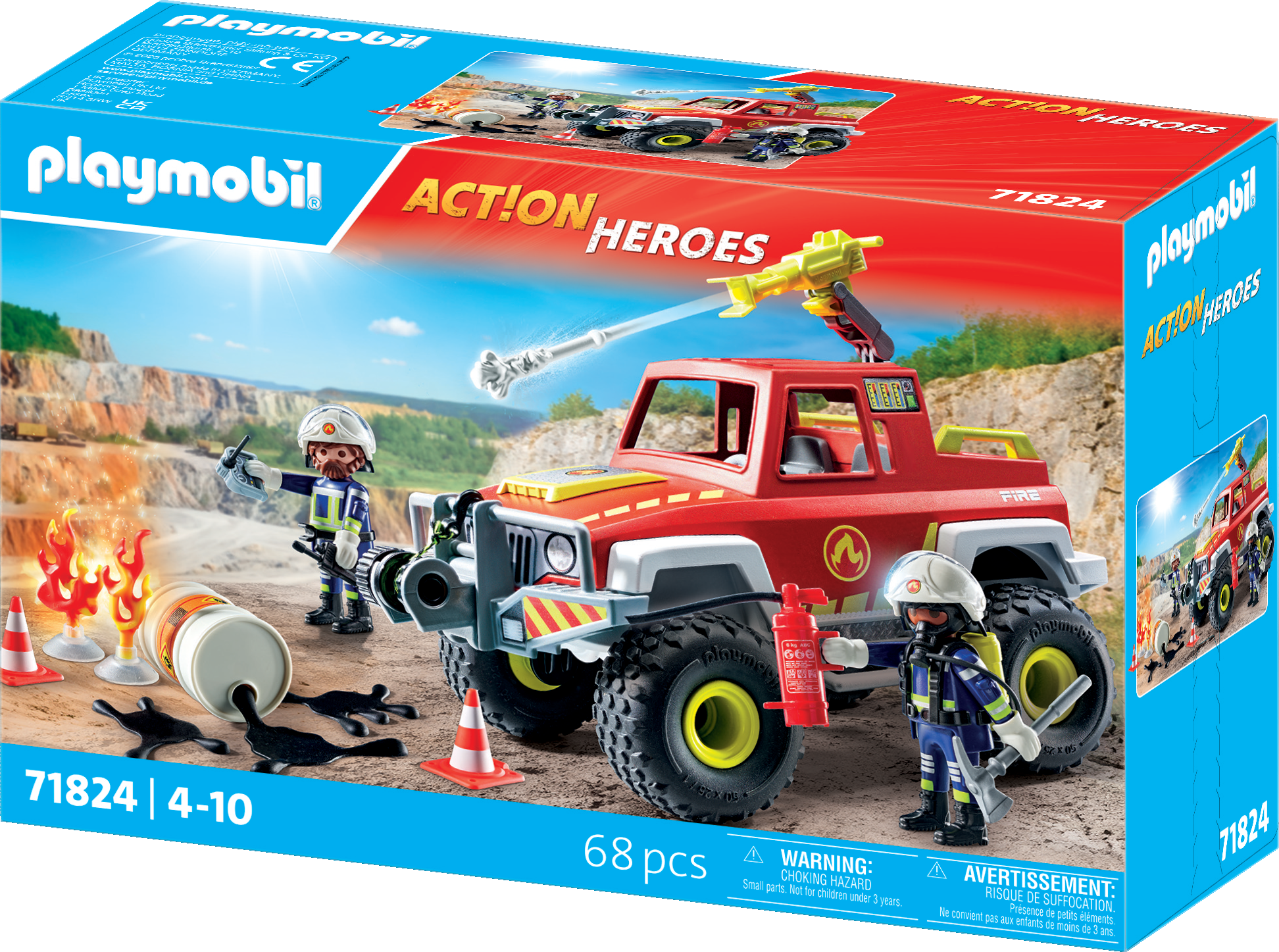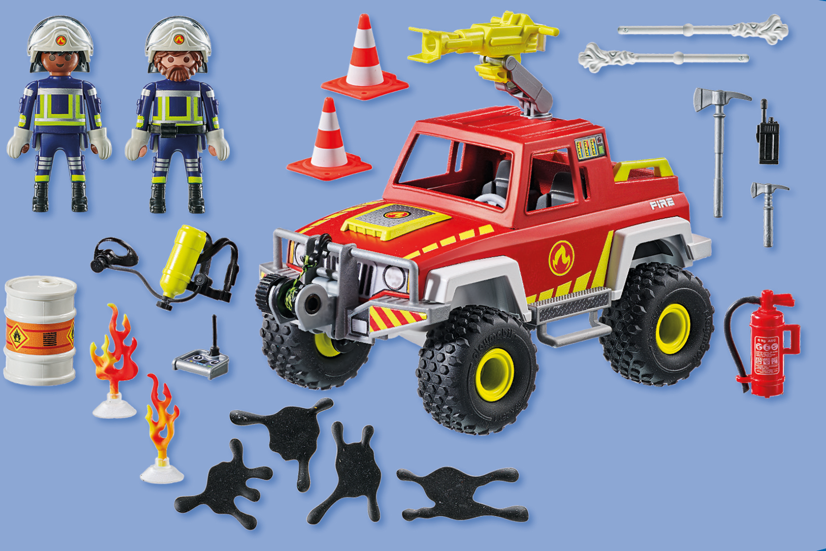 Accessories: 1 off-road fire engine with removable roof, cable winch on cowcatcher, 1 cannon holder, 1 cannon, 2 water arrows, 1 oil can with lid, 4 oil patches, 2 flames with base, 1 mobile radio, 2 axes, 1 remote control with 1 movable joystick that can be snapped onto the belt