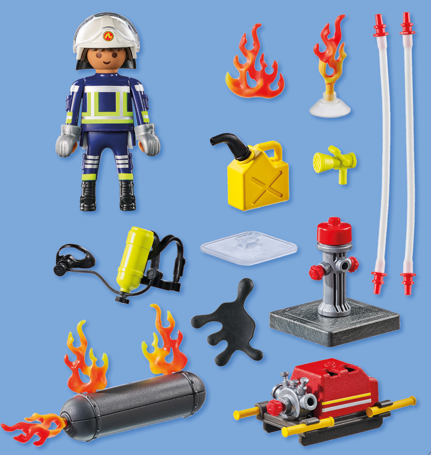 Accessories: 1 gas tank, 4 flames, 1 oil slick, 1 transparent base for flame, 2 water hoses, 1 attachment for water hose, 1 water pump, 1 oil canister, 1 hydrant with base plate