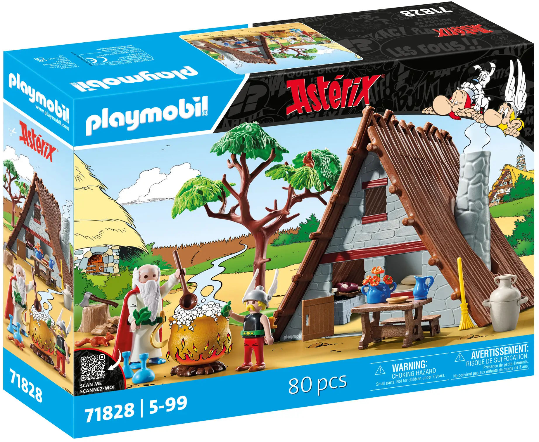 Contents: Asterix, Miraculix, 2 squirrels, Asterix hut, 1 Asterix helmet with wings, 1 drinking bottle, 1 dagger, 1 belt loop, 1 stool, 1 bed, 1 pillow, 1 wooden table, 1 cooking area, 1 set of pans, 1 broom, 1 bench, 1 chopping block, 1 axe, 2 logs, 1 loaf of bread, 1 plate, 1 bowl, 2 pans, 1 flower bush, 1 tree, 1 kettle, 2 bottles, 1 soup spoon, 1 sickle, 1 cloak