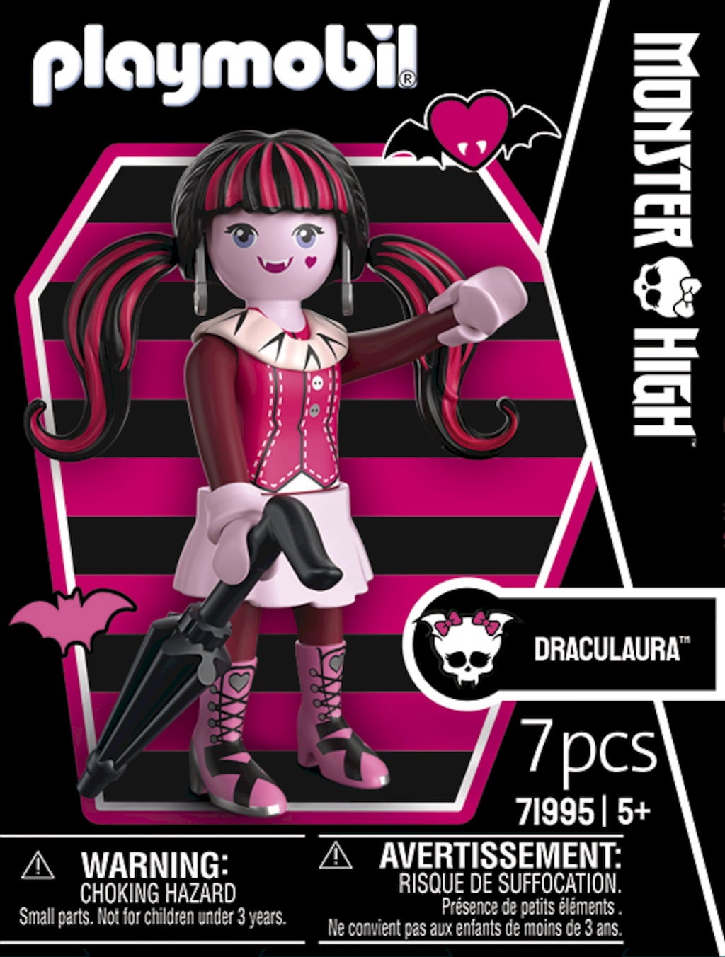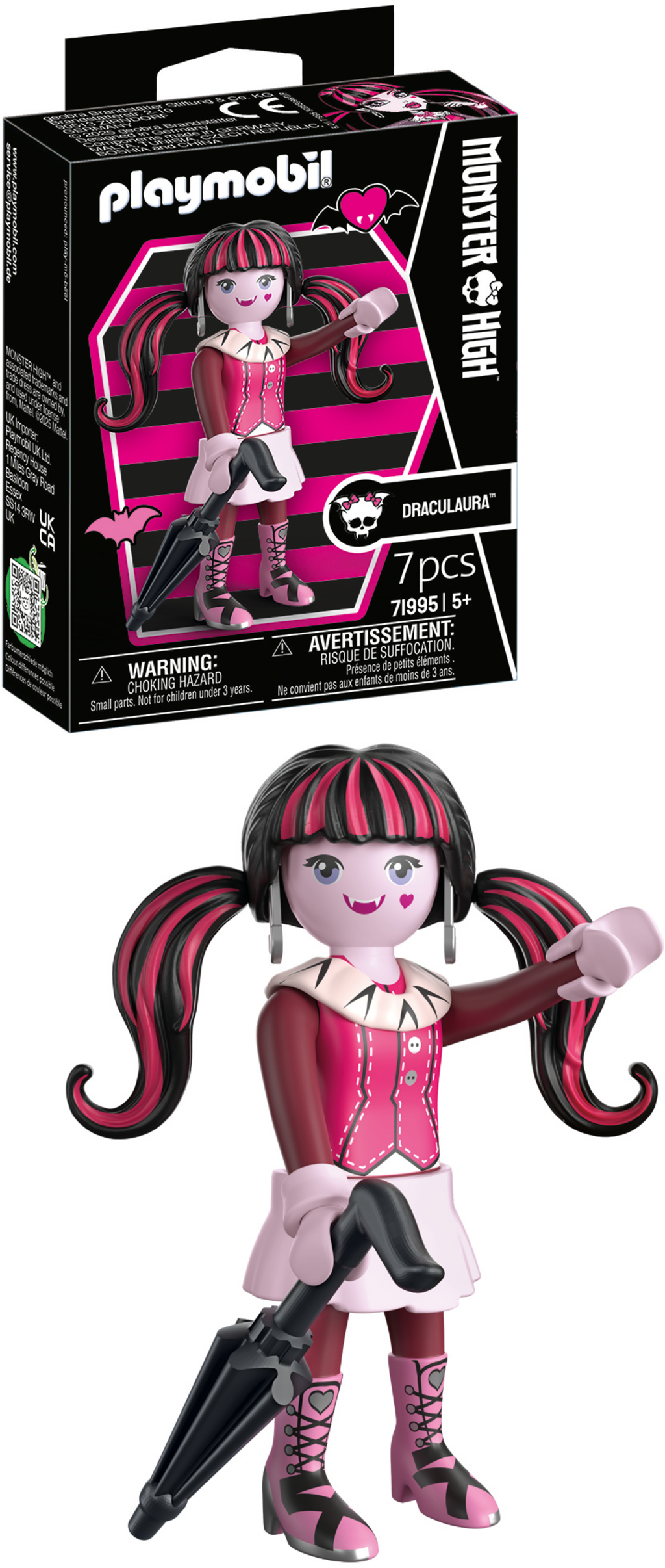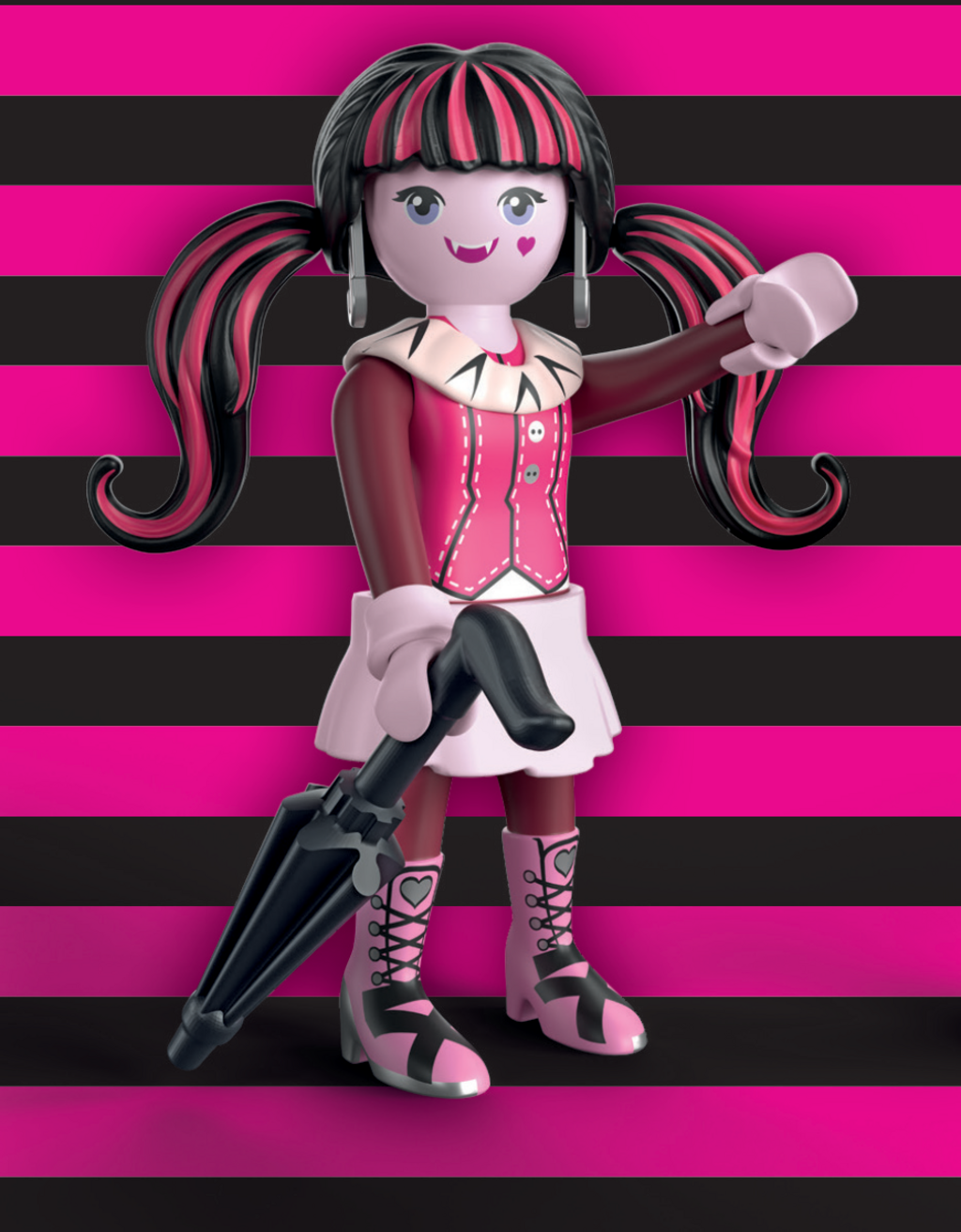 Straight from the eerily beautiful halls of Monster High™, the popular Draculaura flutters towards you as an enchanting PLAYMOBIL figure. She looks stunning in her unmistakable pink and black gothic glamour look and of course comes with her elegant ruffled parasol, which stylishly protects her from the sun. Thanks to the proven modular PLAYMOBIL design, you can move her arms and legs for graceful poses and put her in a new light again and again.
