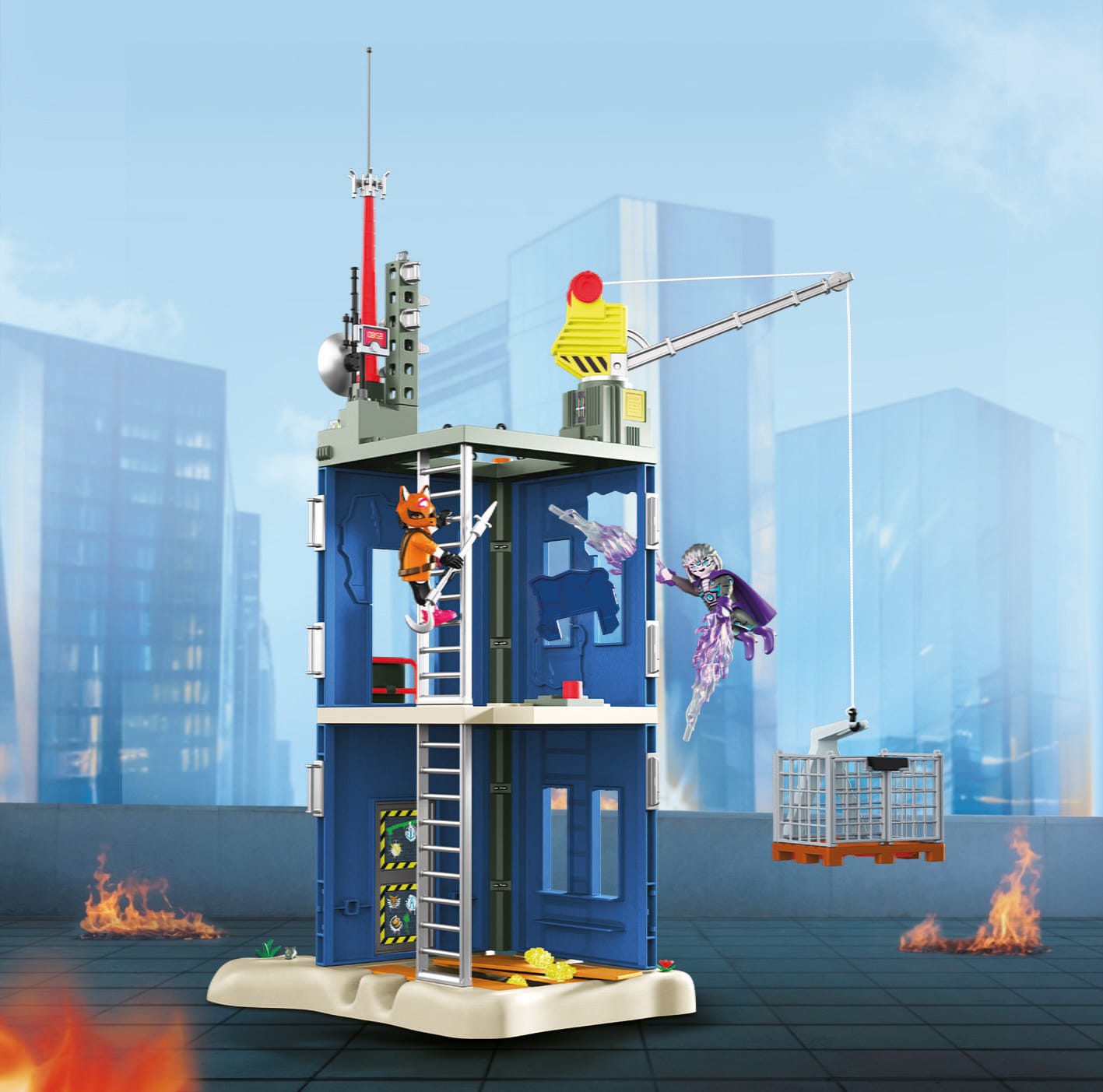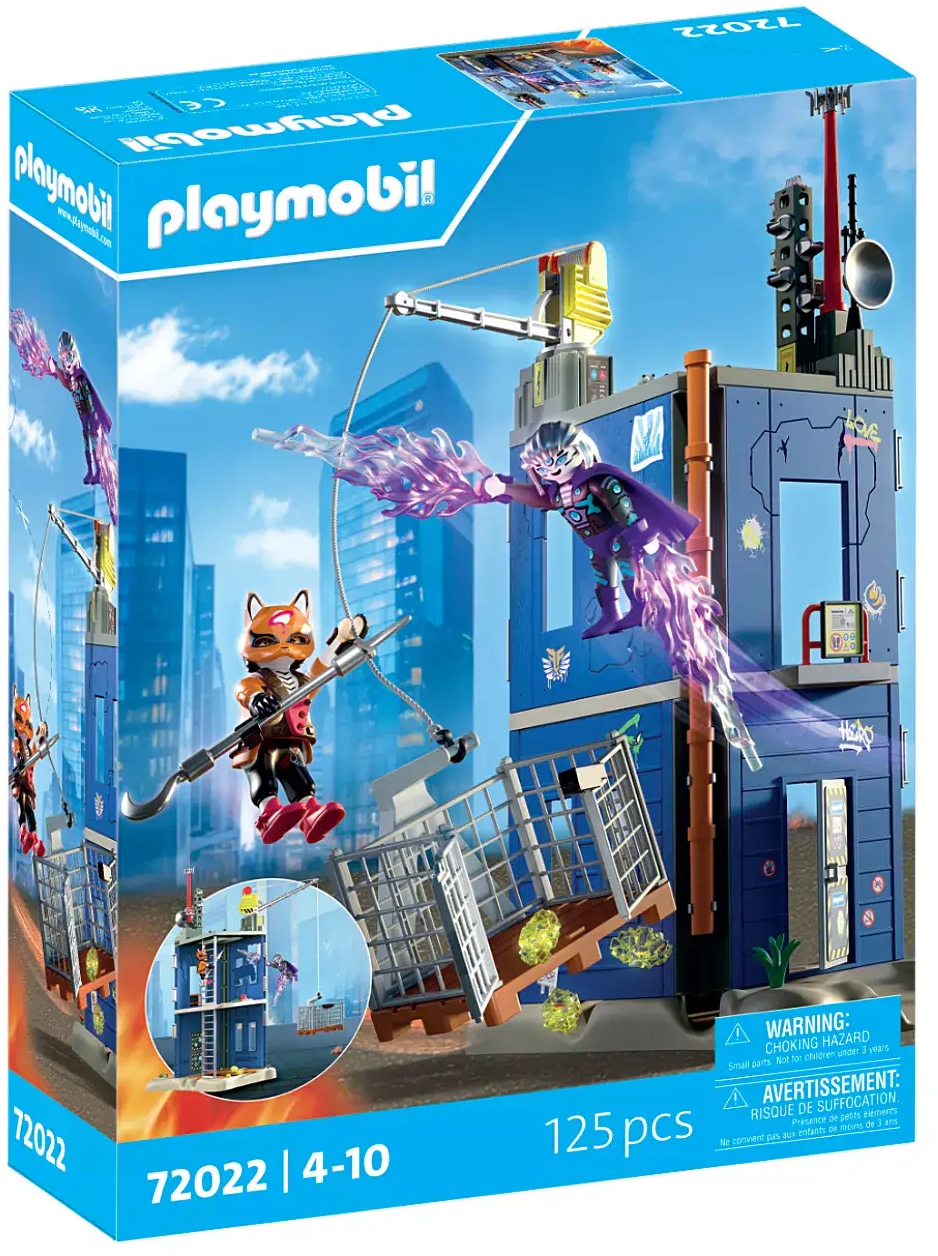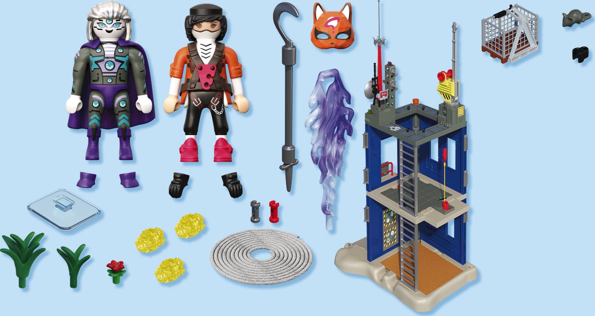 Accessories: 1 base plate, 1 building, 1 roof structure with crane, 4 wooden planks, 2 ladders, 7 stones, 1 hanging sign, 1 fox mask, 2 gloves, 1 climbing harness, 1 rod-shaped throwing weapon, 2 shoes, 1 cape, 2 lightning bolts, 1 dynamite stick with trigger, 1 transmission mast, 1 aerial, 1 cable winch, 1 pallet, 1 mesh basket, 1 rope, 1 label sheet, 2 plants, 7 pipe elements