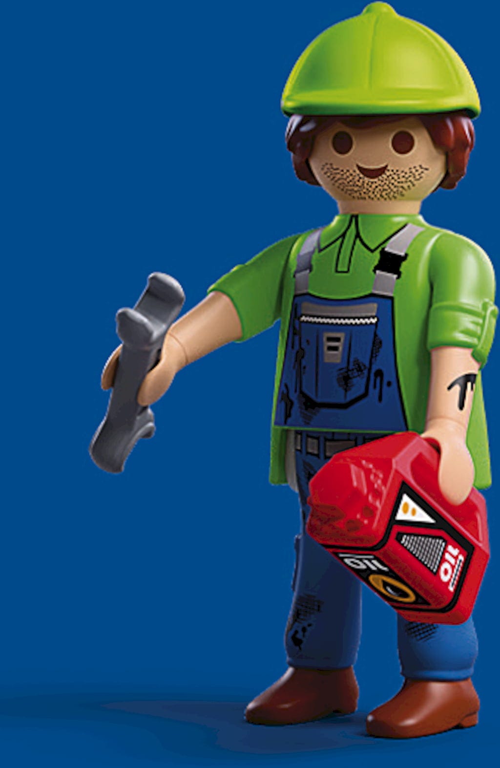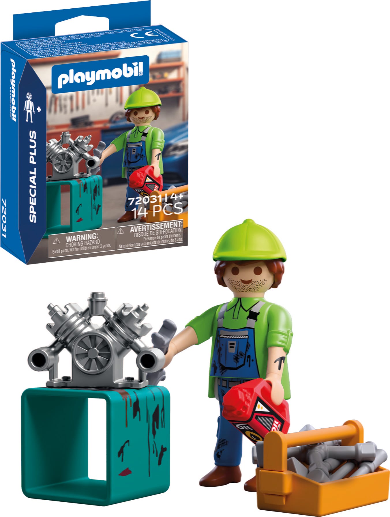 Figures: 1 mechanic, 1 cap, 1 workbench, 1 engine block, 1 toolbox, 1 tool set, 1 oil bottle