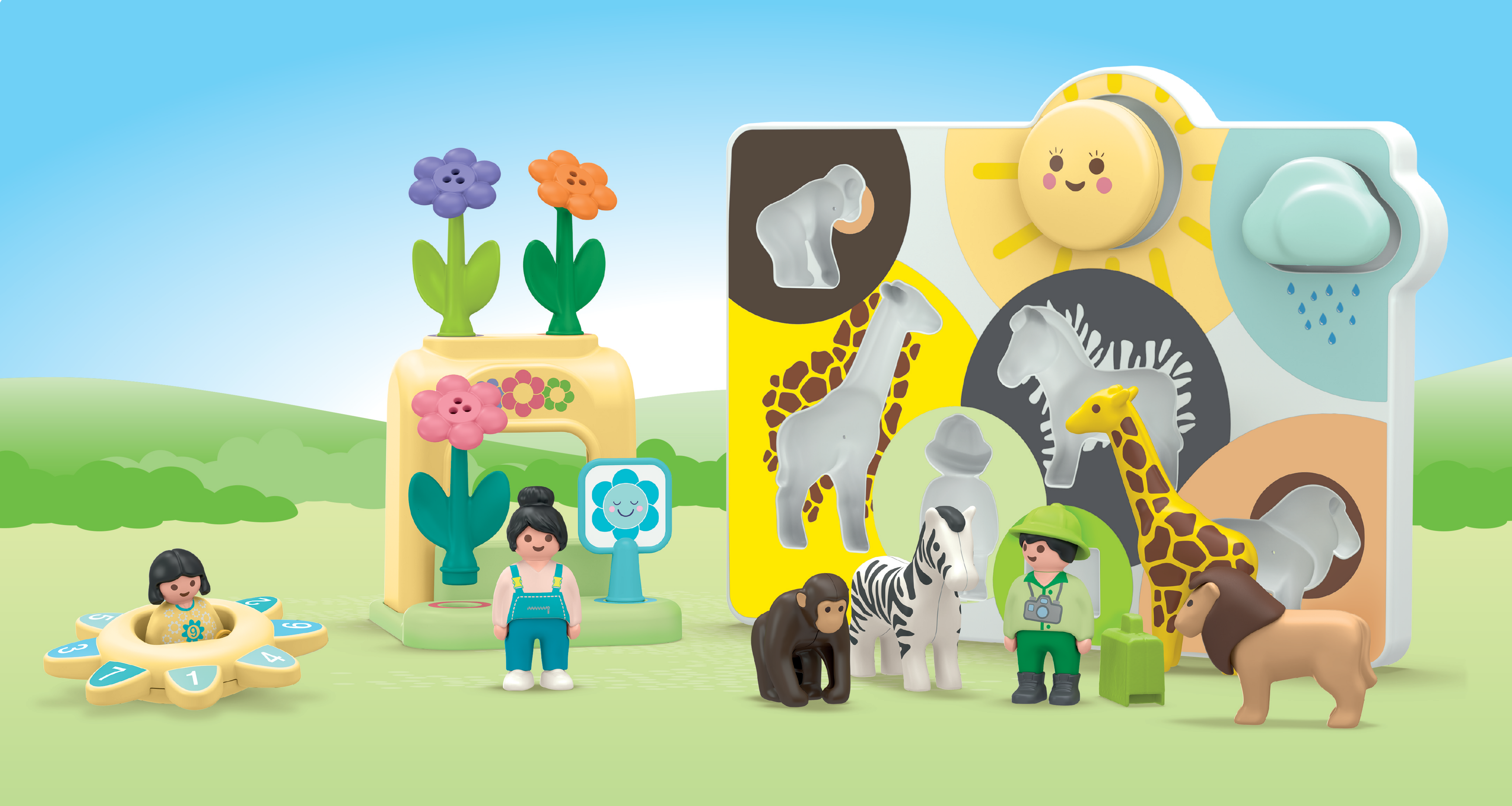 "My first Playmobil" invites children to embark on varied journeys of discovery. The 8-piece wild animal puzzle, the flower stand with colourful flowers, and the number spinning top with rattle function promote motor skills, colour and number understanding. The figures, animals and accessories can be combined as desired and played with creatively - for endless fun in little hands.
