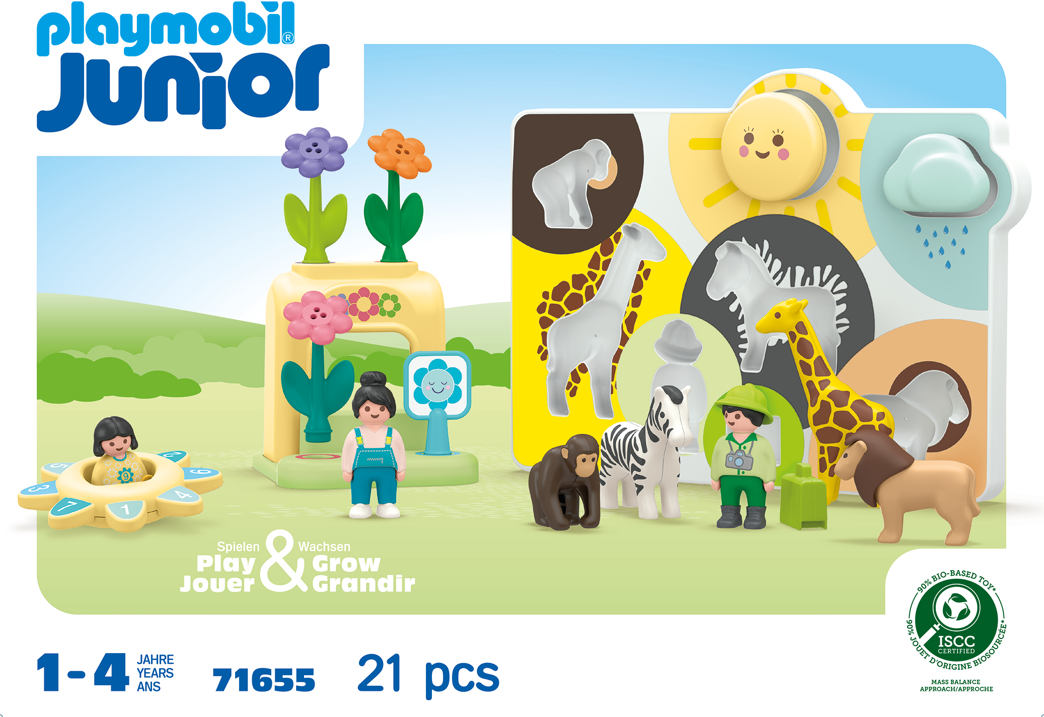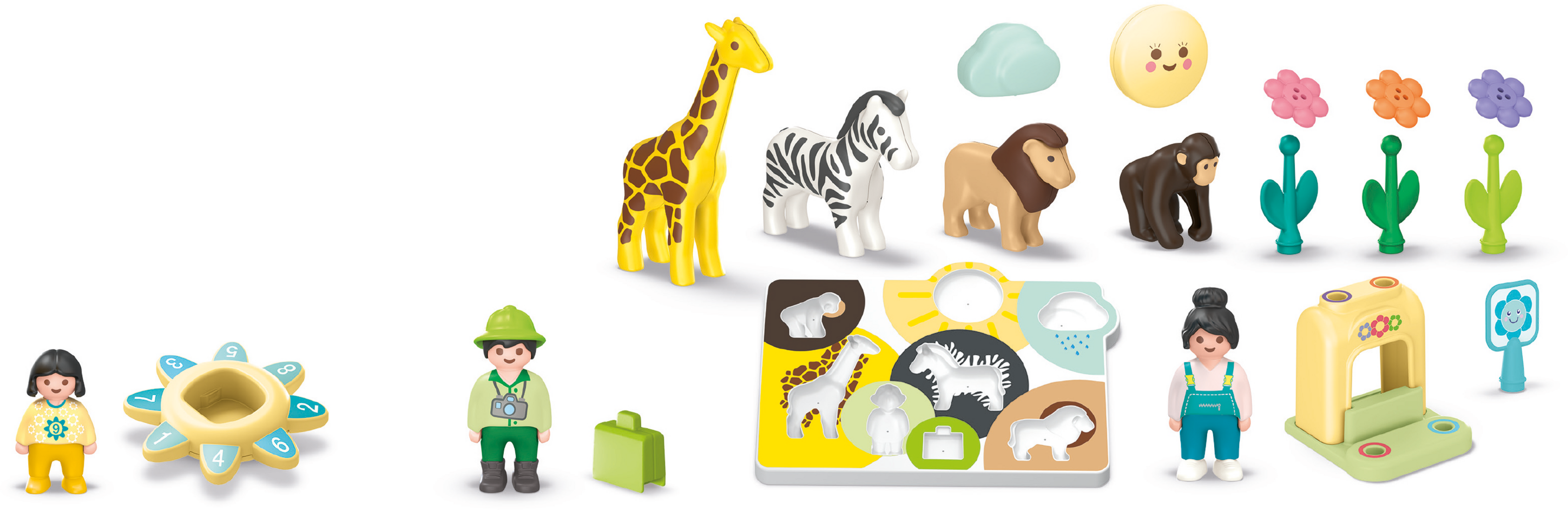 Contents: 1 woman, 1 man, 1 girl, 1 giraffe, 1 zebra, 1 lion, 1 monkey, 1 puzzle board, 1 flower stand, 1 number spinner, 3 flowers, 1 sign, 1 cloud, 1 sun, 1 suitcase