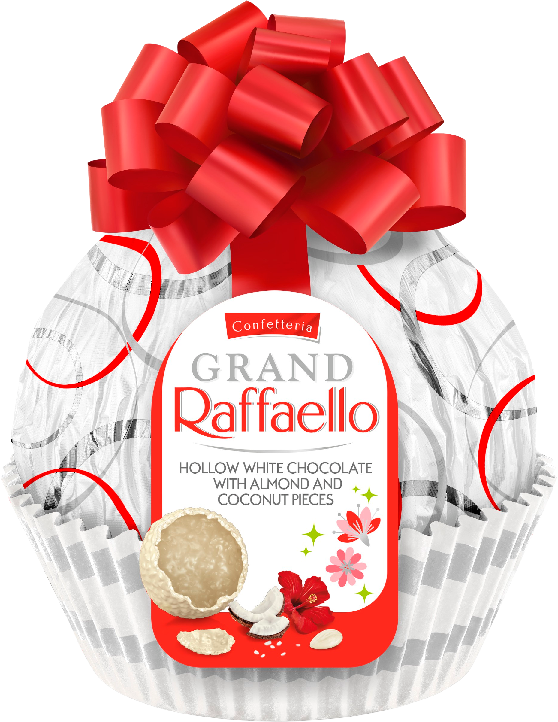 Discover the iconic taste of Raffaello in an impressive new format - the Grand Raffaello. The delicate white chocolate shell with that signature coconut aroma is beautifully finished with crunchy coconut flakes and toasted almond pieces. Wrapped in festive packaging and adorned with a bold red ribbon, it is ideal as a gift.