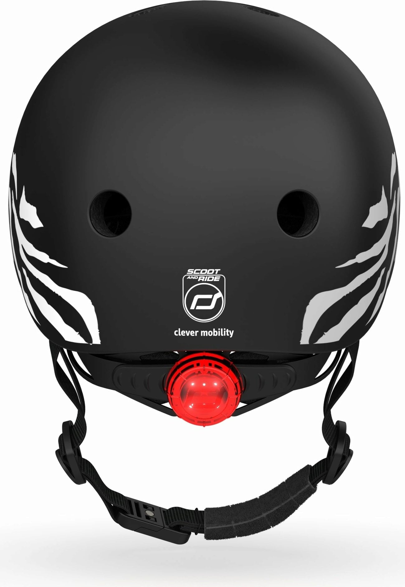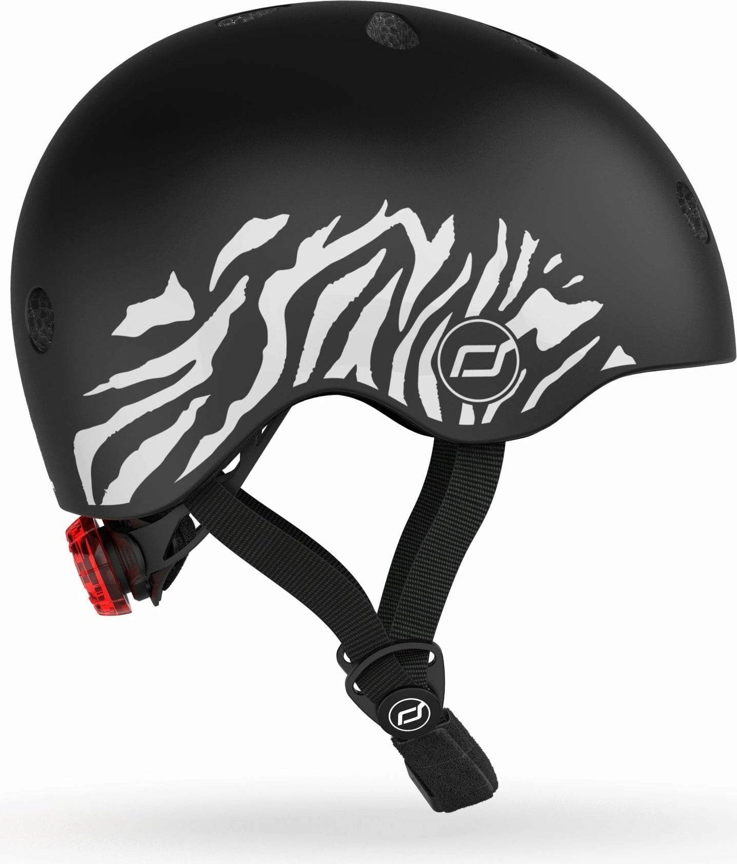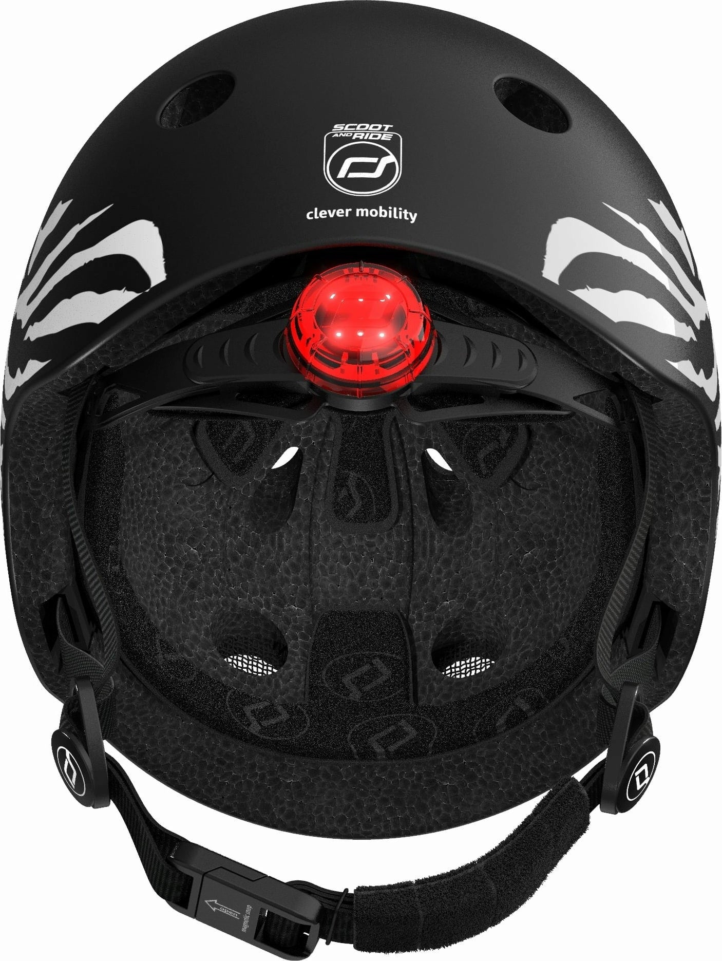 An LED light on the back improves visibility and the breathable padding on the inside is washable. The innovative magnetic fastening allows children to open and fasten the helmet without the help of their parents and without pinching their skin.