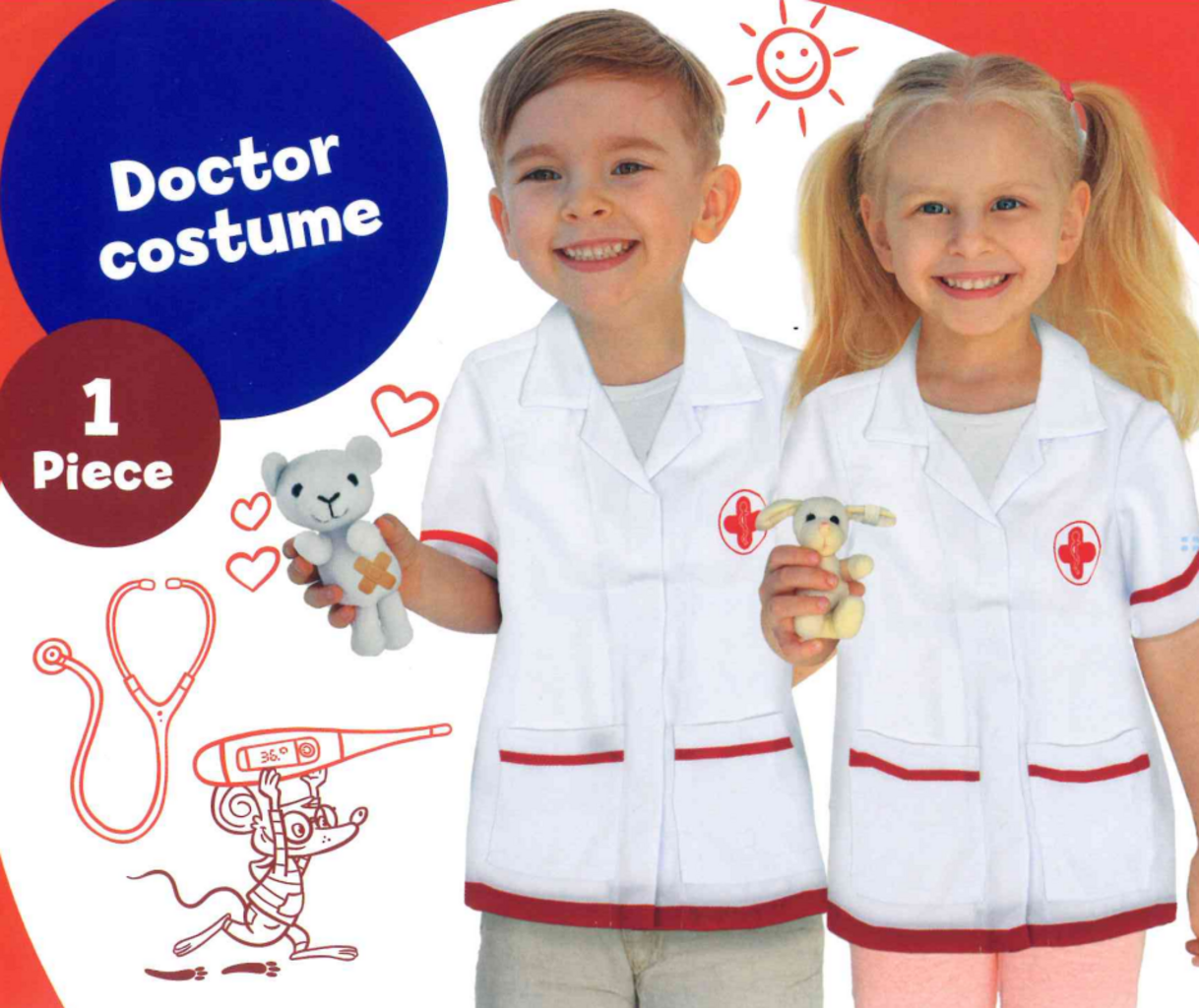 Oh dear, your favourite cuddly toy has a stomach ache! Luckily, with this smock, kids can pretend to be doctors. The stuffed animal is lovingly examined. The diagnostic devices printed on the coat are perfect for this. When Teddy has been well taken care of, it's off to the next patient.