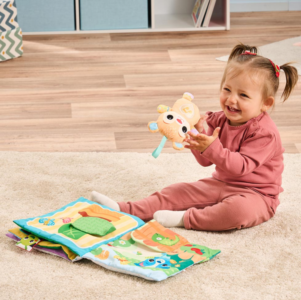This large plush book invites little explorers to discover the world through play. Lovingly designed pages, interactive elements and cheerful music make learning exciting and stimulate the senses. Perfect for hours of cuddling and play full of fun and discovery.